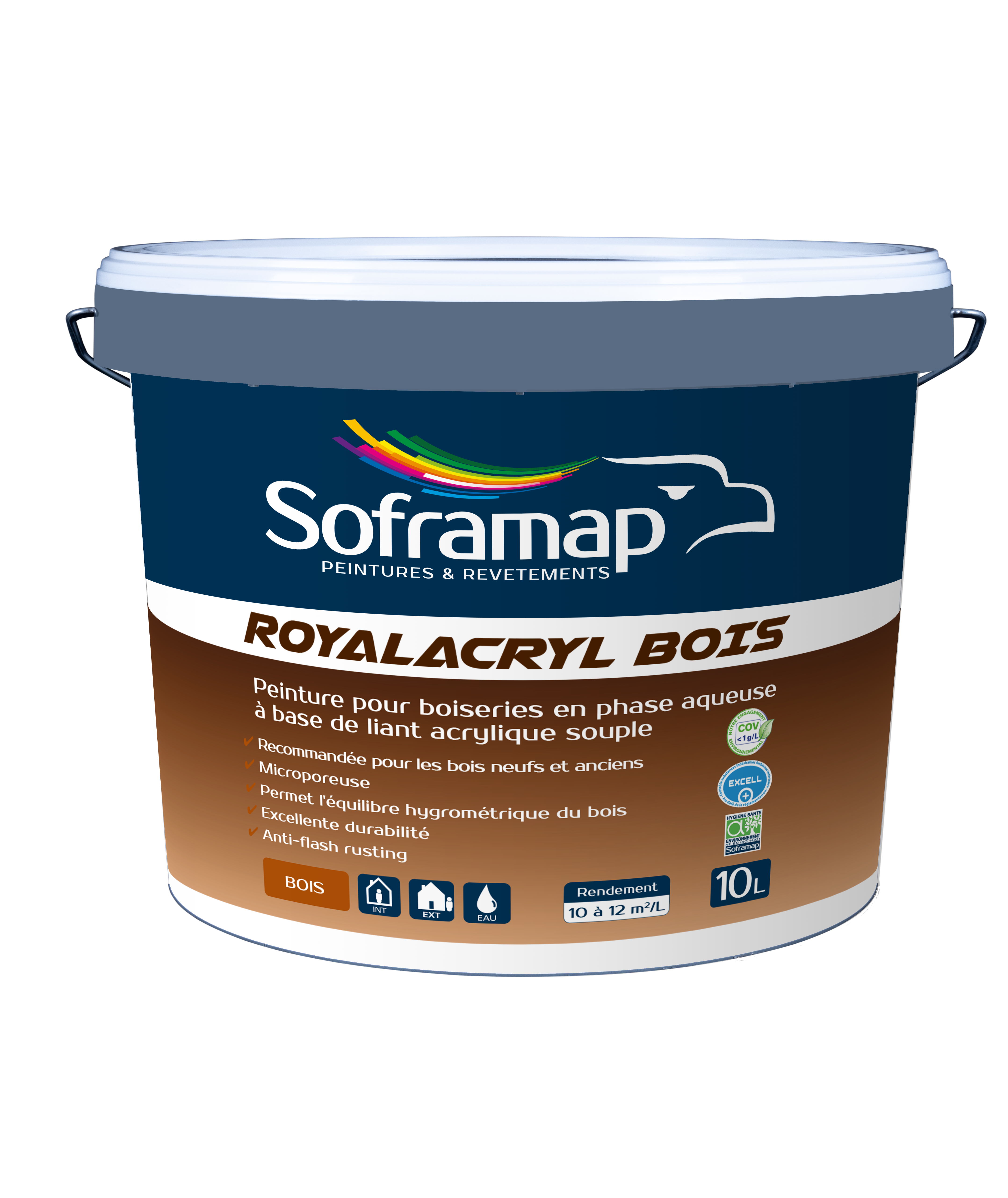 Peinture pour boiseries en phase aqueuse à base de liant acrylique souple. Pour la protection et la décoration en extérieur et intérieur des bois. S’applique sur huisseries, portes, fenêtres, bardages, clôtures, charpentes, lambris, clins, dessous de toit…