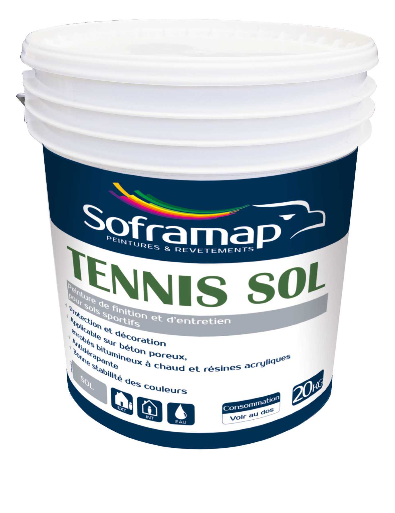 Peinture de finition et d’entretien pour sols sportifs. Pour la mise en peinture des revêtements de sols sportifs (terrains de tennis, terrains multisports (hand-ball, basket-ball, badmington, volley-ball…), aires de jeux ; pistes piétonnes, cyclables, terres-pleins centraux autoroutiers ou urbains. S’applique sur ciment, béton, enrobé bitumineux.