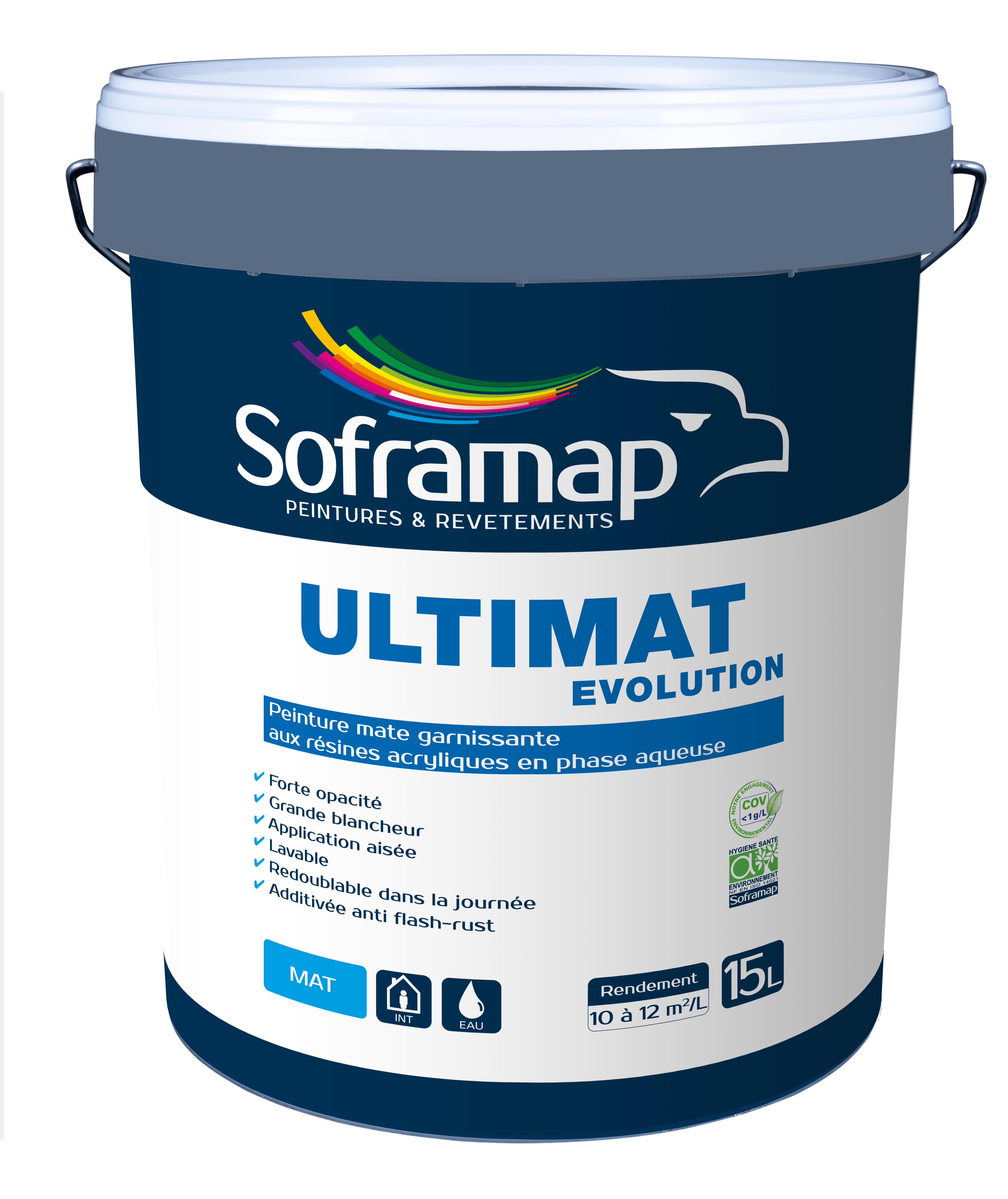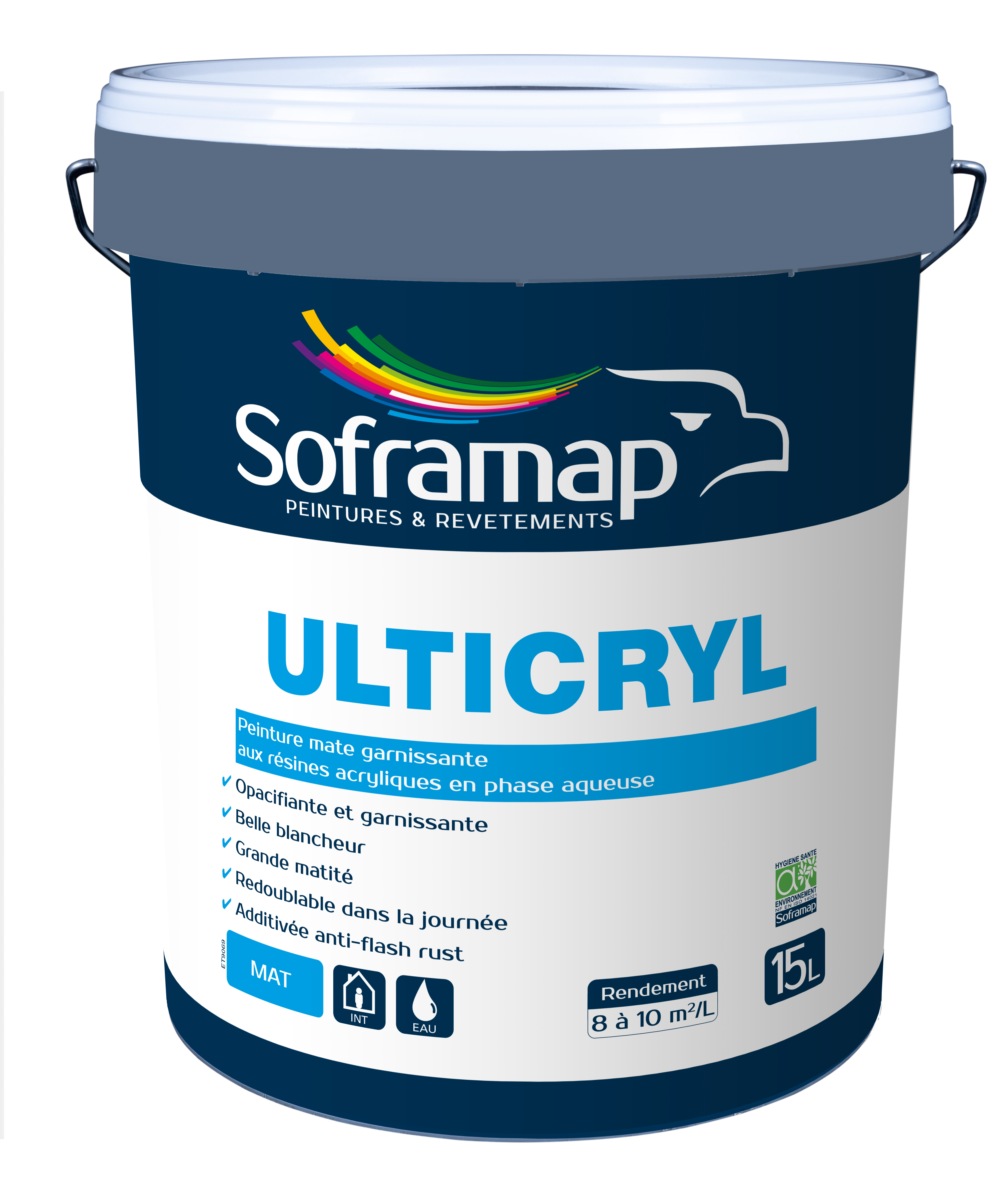 Peinture acrylique, mate, pour surfaces intérieures. Pour la décoration des maçonneries intérieures sur tous supports traditionnels du bâtiment. S’applique en travaux neufs, d’entretien ou de rénovation sur murs et plafonds de pièces sèches et dans les locaux à trafic intense où le problème de l’odeur peut se poser au moment de l’application (hôpitaux, locaux scolaires, administratifs, cuisines, cages d’escaliers, couloirs, etc).